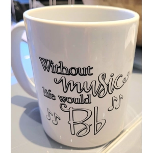 "Without Music Life Would Be Flat" cup White with black design. One side has quote printed and other a upward wave of music notes Ceramic cup 11oz Standared white cup
